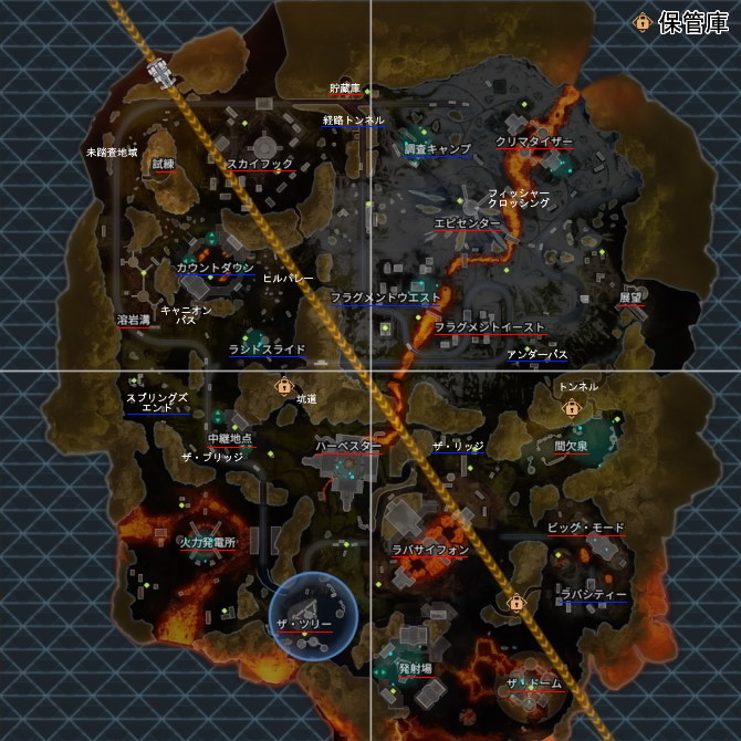 | ラバシティー | ミッドティア | 駅がある街。 S17でスタックスに改築された。 ![]() | 物資量はそこそこ。保管庫の鍵をゲットしたら西側の洞窟に直行しよう。 | |