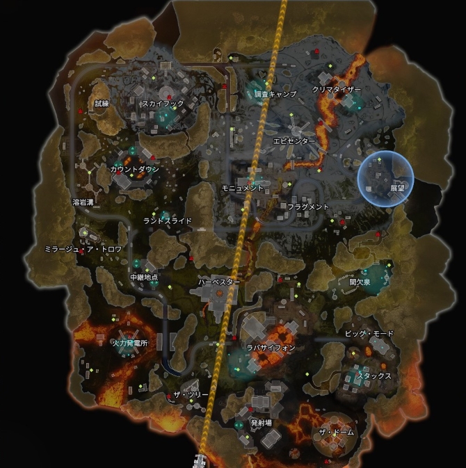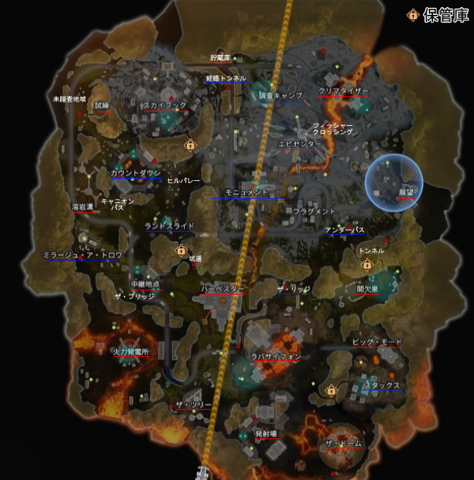 | 火力発電所 | ハイティア | 溶岩の上に立つ大きなタワーからなるエリア。 ![]() ![]() (画像集 ) | 漁れるポイントが遠く離れているため、敵がいない場合は散開推奨。 | |