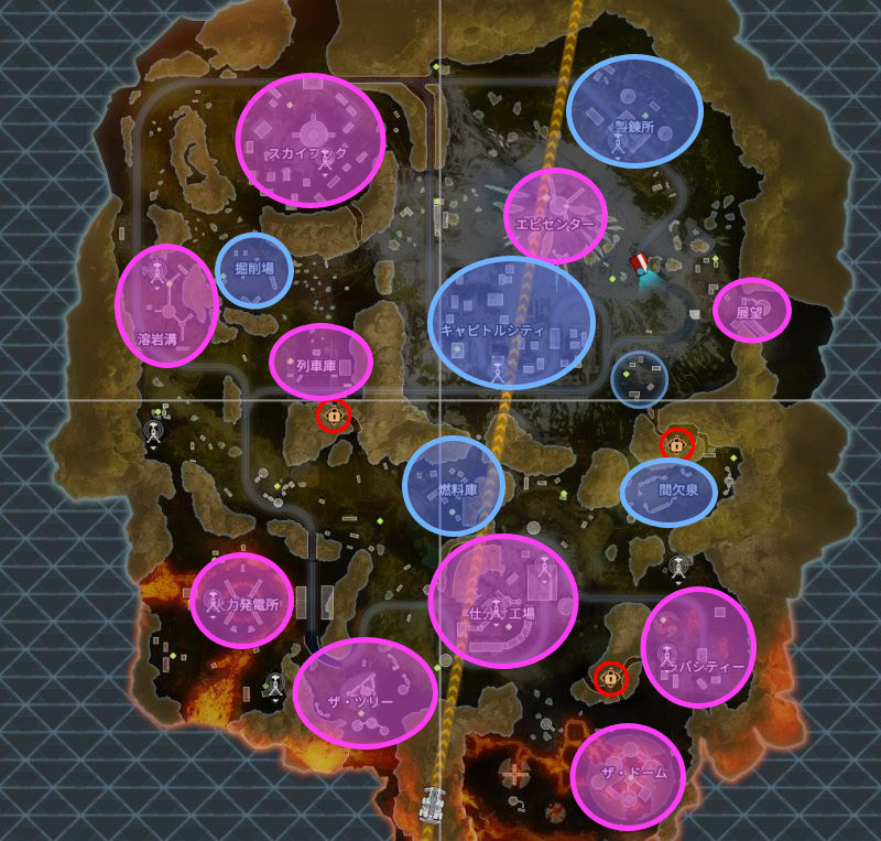 | ザ・ドーム | ハイティア | 卵の殻のようなものに覆われた建物があるエリア。 ![]() | 物資量が少なく周辺が人気降下地点のため物資不足になりやすい | |