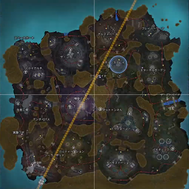 | N. プロムナード | ミッドティア | 現在の検疫ゾーンに当たるエリア。正式名「ノースプロムナード」。マップの中心にそびえる巨大な壁。内部は細長い形状の商店街エリア。 ※s21で削除 中盤以降は各地から部隊が集まり、瞬く間に戦闘地帯と化す。 ![]() S.プロムナード(画像左) N.プロムナード(画像右) | 序盤は比較的すいている。スタシスアレイに複数部隊降下していた場合は、漁りを早めに切り上げて漁夫狙いも可能。 | |